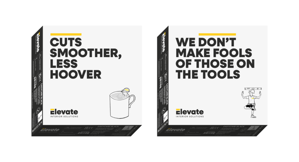 The creation of a character (or characters) went a long way to adding some warmth and personality to what can be perceived as a “no frills”, direct typographic design solution. “Tyler” as we like to call him is “your man on the tools” – he’s been there, done it, knows what he wants and he’ll get the job done. Elevate are there to support Tyler at every stage – a winning team delivering a quality product more effectively and cheaper than the competition..