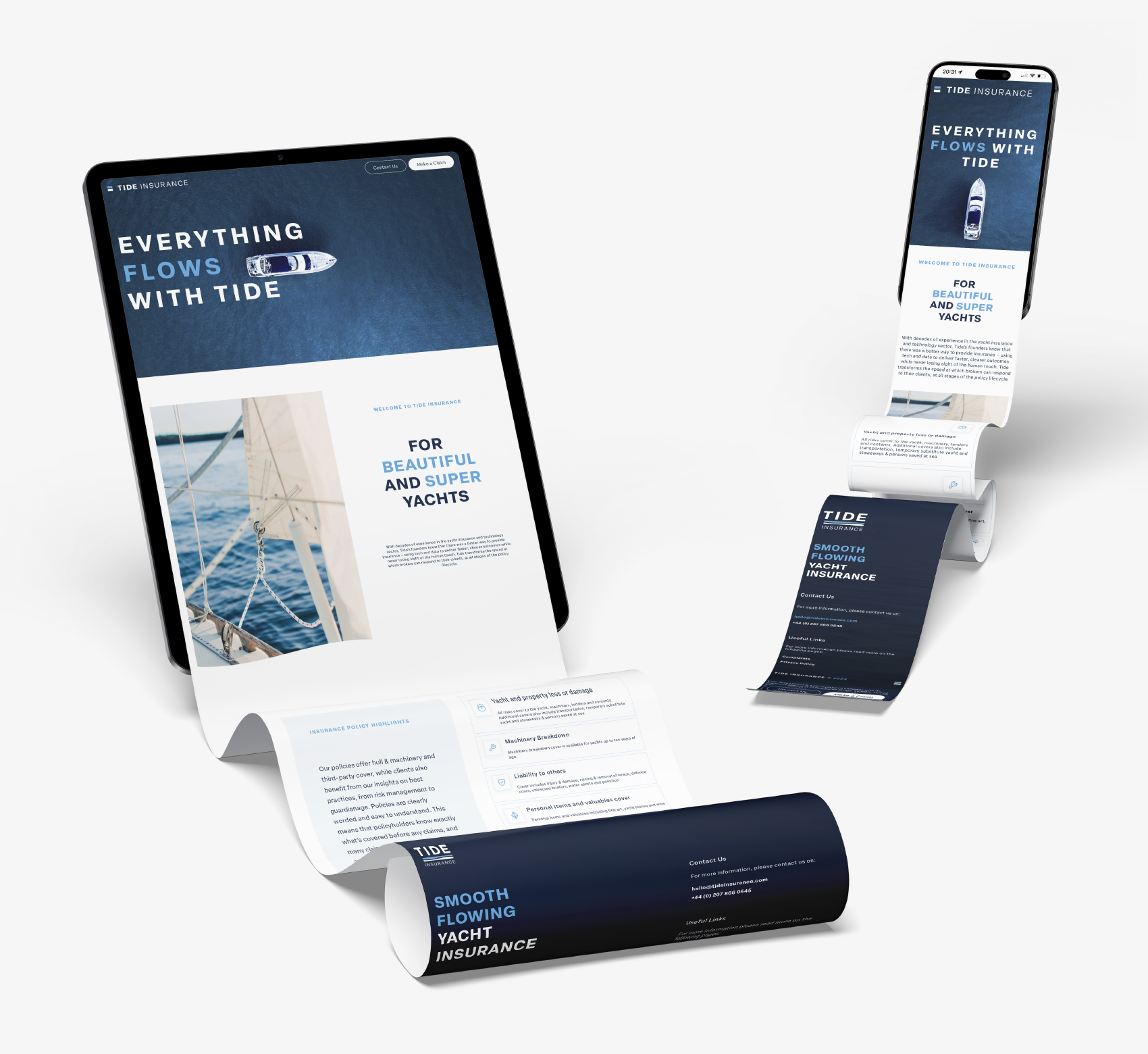 The founders of Tide Insurance had the knowledge and expertise; however they required creative support to position the company creatively within this evolving specialist sector. Market research highlighted a trend towards a new generation of millennial superyacht owner, driving a change in owner culture and desire. The company had been built around technology and a proactive, customer-driven service, targeting a younger audience, but they needed clarity regarding their brand narrative and proposition. Supporting this they required a bold, confident visual identity that bridged the gap between traditional and new age; a simple graphic system that can be applied efficiently across both digital and print – a system that would allow them to grow and a look that would complement, not overpower the beauty that surrounds yacht ownership.